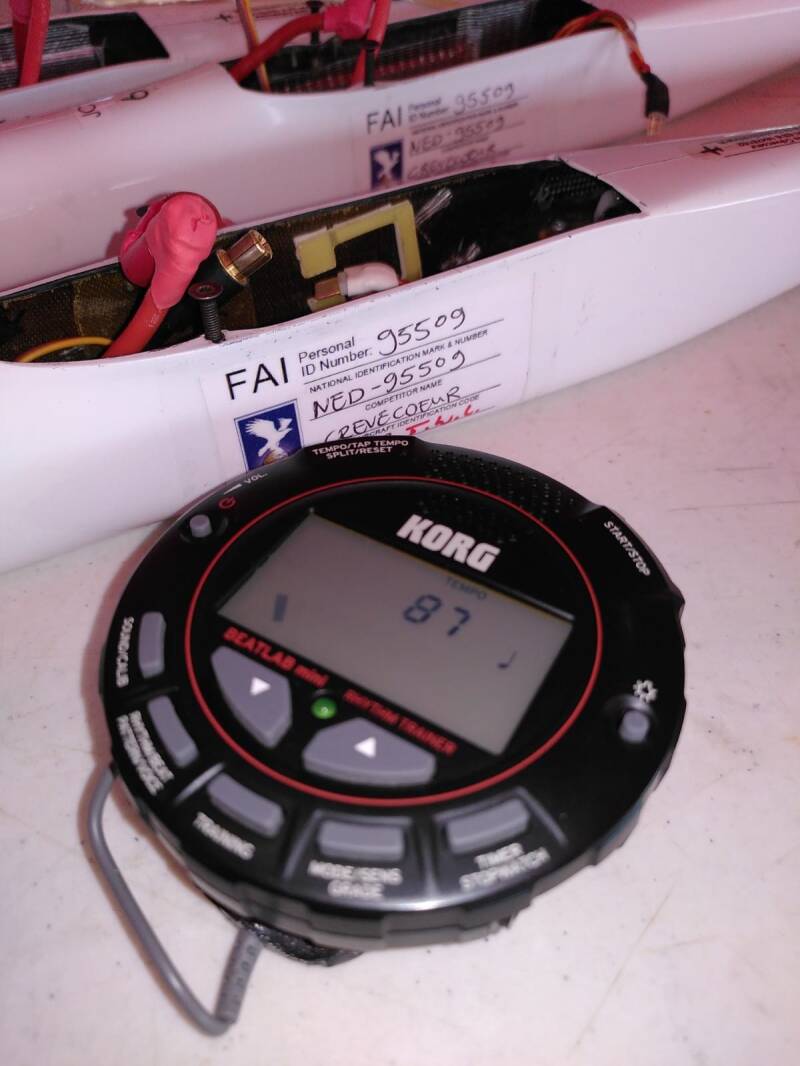 Maar eerst nog even naar het begin van de dag. Jan had gisteravond op de teammanagersvergadering te horen gekregen dat vliegen met een metronoom in de hand van de helper, zoals Peet en ik, maar ook Wim en Bram doen niet toegestaan is. Dit apparaatje trilt met een bepaald interval en zorgt er op die manier voor dat de helper het ruiste ritme kan afroepen naar de piloot zodat die op zijn beurt op het juiste moment om de pylon stuurt. Typisch een ding was je moet zien en vasthouden om te begrijpen hoe het nou precies werkt. Wij hebben er veel baat bij om constant te vliegen. We schrokken dus nogal van de mededeling van Jan. Mag dat nu ineens niet meer? Wat staat daarover in het reglement? En wat te doen zonder? Gelukkig bleek het een storm in een glas water en is het verbod snel weer ingetrokken na navraag van Jan en Wim. De bedoeling van de regel is eigenlijk dat er geen helpers bij de toppylon gaan staan en met een walkie talkie de piloot gaan coachen. De regel werd in dit geval verkeerd uitgelegd. Gelukkig is het zonder veel discussie rechtgezet. Hieronder een foto van het apparaatje ingesteld op 87BPM. Achterop zit een triller die dan 87 keer per minuut een korte puls geeft. Als je dan te krap zit op top stel je de BPMs wat lager in, zodat het tellen langzamer gaat en je verder doorvliegt. Theoretisch geeft 1BPM minder of meer ongeveer 2,5m langer of korter vliegen naar de toppylon.